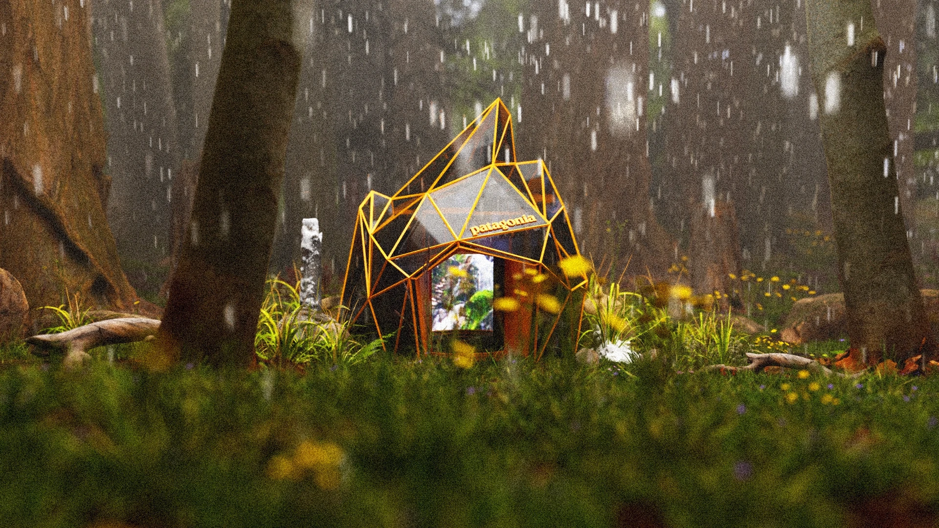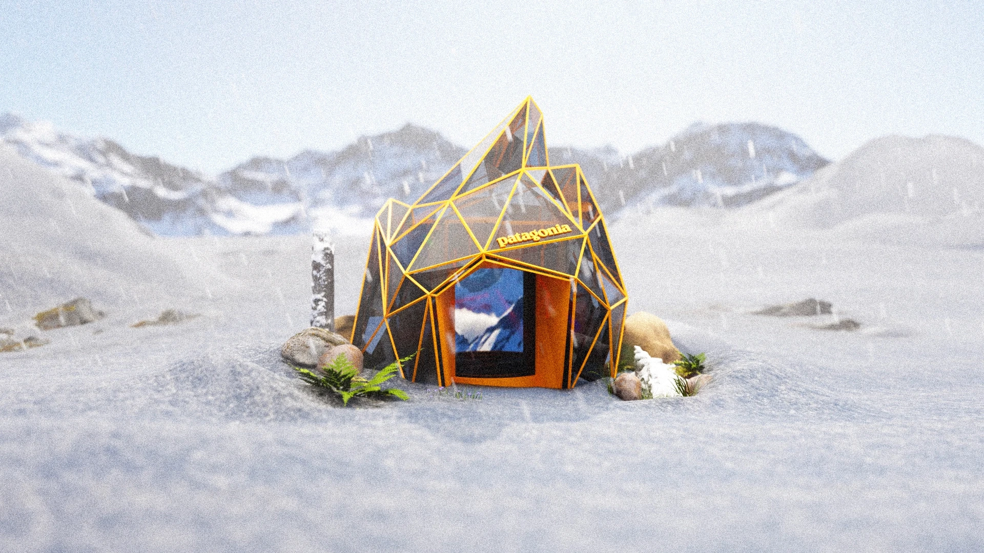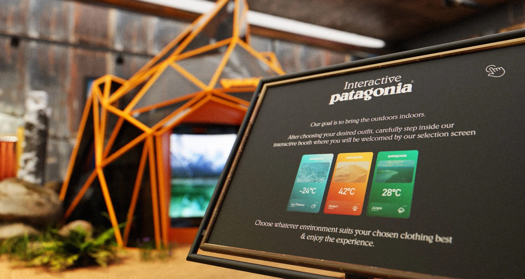 Patagonia Interactive is a concept project developed and sent to Patagonia as creative inspiration. The idea centers around an interactive in-store booth — an ice sculpture-like structure with orange edges — where store visitors can step inside, choose an environment, and experience real weather conditions such as wind and rain while wearing Patagonia clothing. The purpose is simple: give the customer a genuine sense of how the gear performs before they buy it.