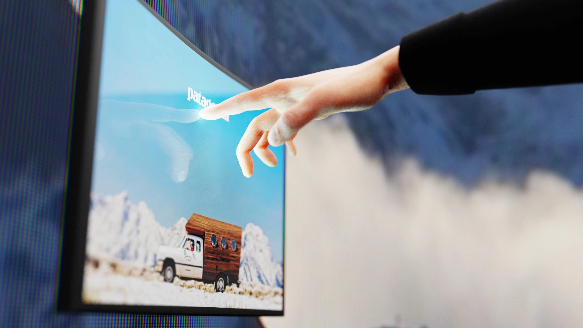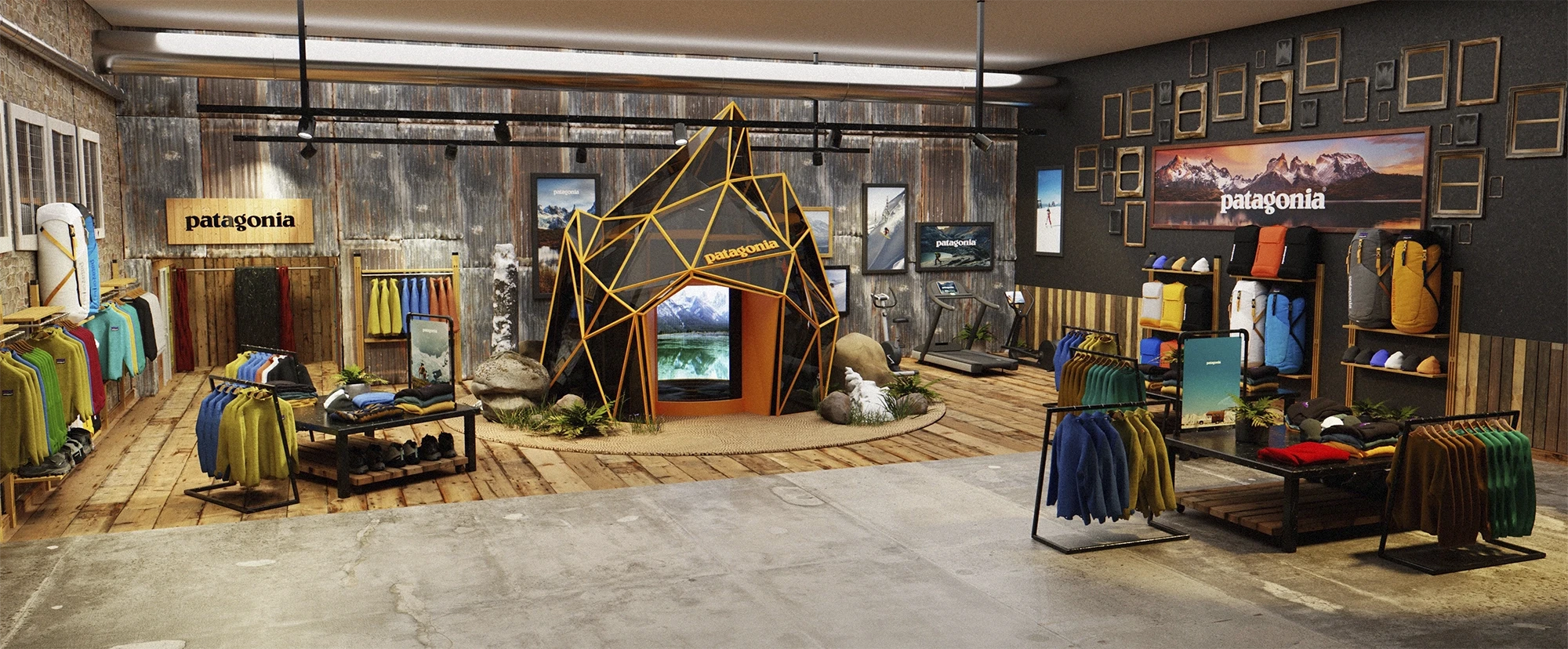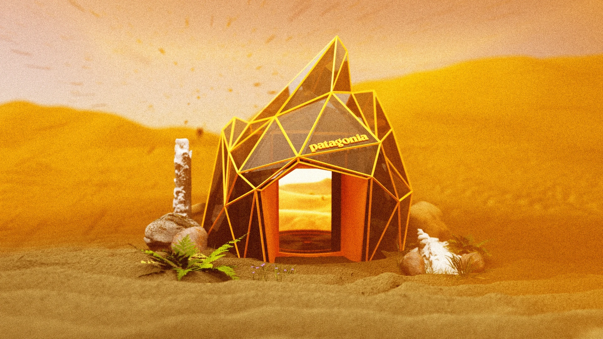 Patagonia Interactive is a concept project developed and sent to Patagonia as creative inspiration. The idea centers around an interactive in-store booth — an ice sculpture-like structure with orange edges — where store visitors can step inside, choose an environment, and experience real weather conditions such as wind and rain while wearing Patagonia clothing. The purpose is simple: give the customer a genuine sense of how the gear performs before they buy it.