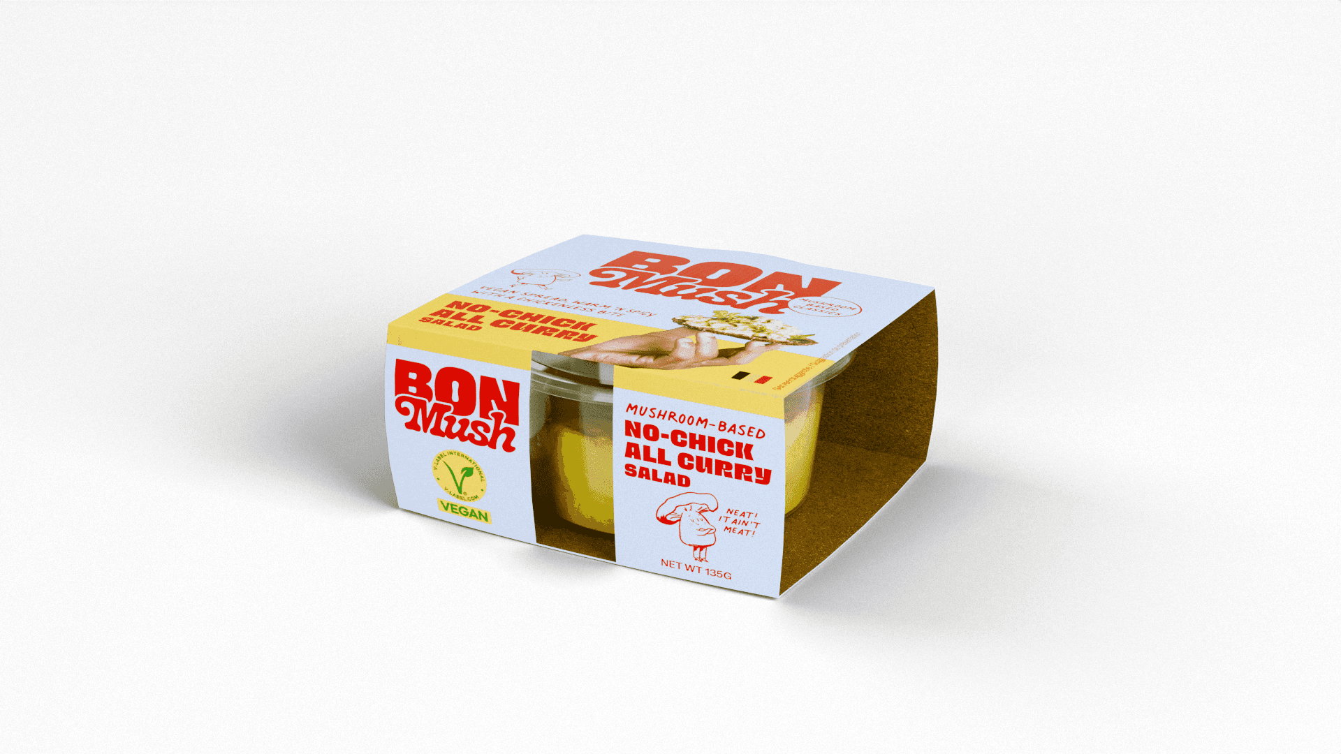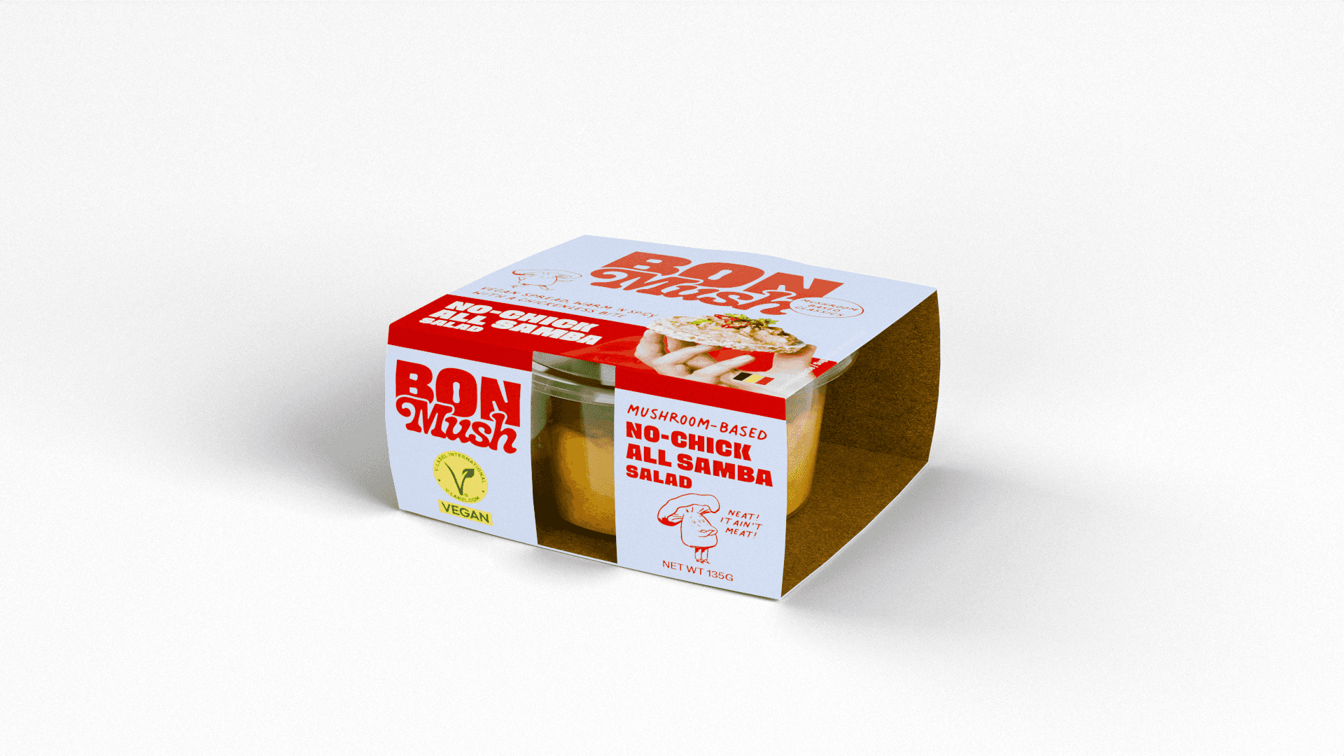 Bon Mush is a Belgian company producing salad spreads made from oyster mushrooms. We created 3D product shots for three of their spreads — a curry, a samba, and a sea salad — each presented in a studio scene built entirely in Blender.